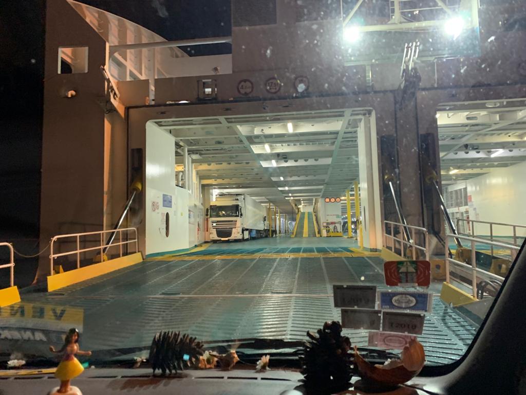 Über ein Online-Portal konnten wir ohne Probleme unser Fähr-Ticket kaufen. Außer einem Einreise-Formular für Italien war nichts weiter nötig. (Stand Januar 2021) So sind wir am Abend kurz vor Sonnenuntergang nach einem Tag voller schweren Abschiede nach Patras aufgebrochen. Abfahrt der Fähre war genau um Mitternacht, doch bereits gegen 22 Uhr konnten wir auf die Fähre fahren. Da wir zwei Nächte auf der Fähre verbrachten, haben wir uns ein Zimmer mitgebucht. Das Check-In ging super schnell und so haben wir beim Ablegen bereits geschlafen. 😉